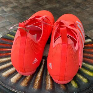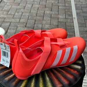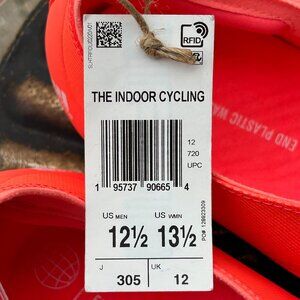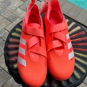 A new pair of Adidas “The Indoor Cycling” Cycling Shoes with tags attached but without a box. The official color pattern is Turbo/Cloud White/Acid Red. I would say they are a reddish orange with white stripes. Model GZ6343. These are unisex shoes. Size is Men’s 12.5 - Women’s 13.5.