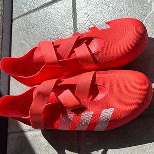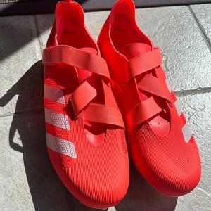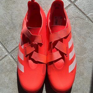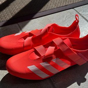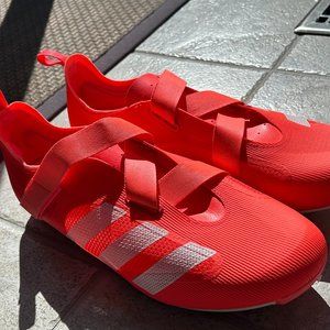 A new pair of Adidas “The Indoor Cycling” Cycling Shoes sticker with model number affixed but without a box. The color pattern is Turbo/Cloud White/Acid Red. I would say they are a reddish orange with white stripes. Model GZ6343. These are unisex shoes. Size is Men’s 13 ½ - Women’s 14 ½.