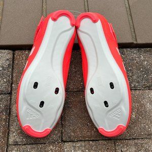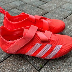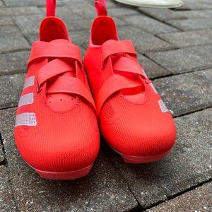 A new pair of Adidas “The Indoor Cycling” Cycling Shoes with tags attached but without a box. The official color pattern is Turbo/Cloud White/Acid Red. I would say they are a reddish orange with white stripes. Model GZ6343. These are unisex shoes. Size is Men’s 4 - Women’s 5.