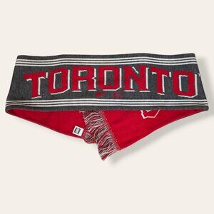 This scarf by Adidas (and Toronto FC) doesn't have a tag listing material contents, but my best guess is a knit acrylic. The scarf has a red side and a grey side, both of which say "TORONTO FC". The grey side has Adidas branding towards the ends, while the red side has a split logo for Toronto FC. Both ends have a short fringe in red, white, and grey. The scarf has little wear and no issues affecting wearability.