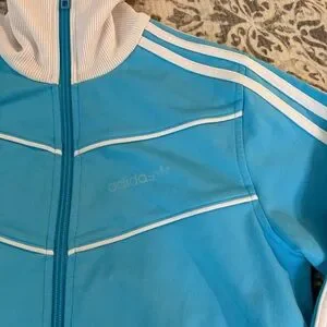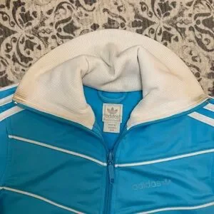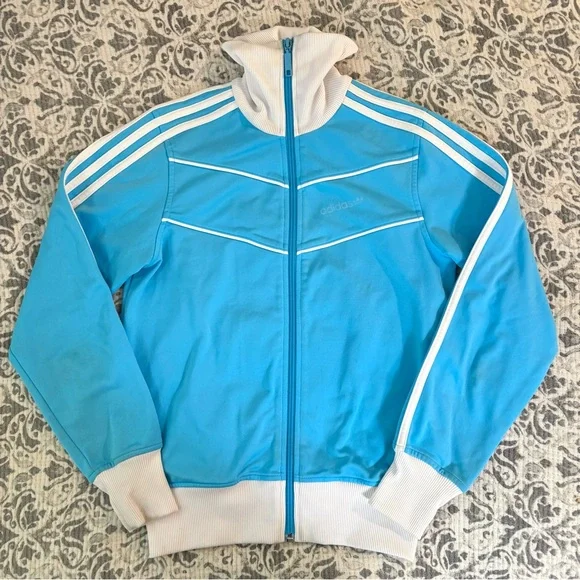 Adidas track jacket in bright blue with signature white three stripe detailing.
