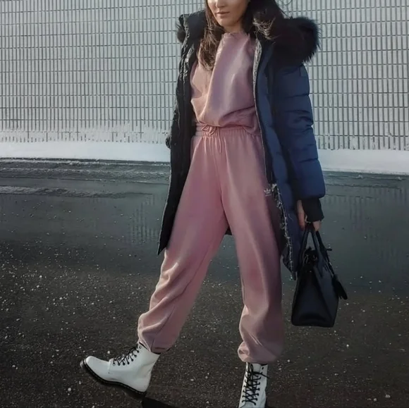 Oversized fit crew neck sweater (slightly cropped boxy fit) and high-waisted joggers.
