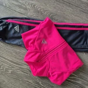 This stylish Adidas kids track suit features a vibrant pink jacket paired with sleek black pants. Perfect for active days, it combines comfort with iconic style.