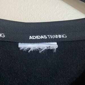 A black training crew neck by Adidas, has zippers that run up both sides from bottom to below the arm pits.