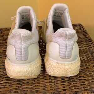 Comfortable Adidas Ultra Boost shoes in white/blue and cream. Ideal for running and everyday use.