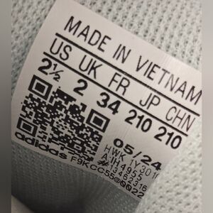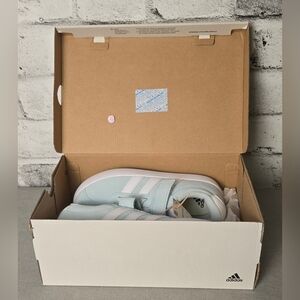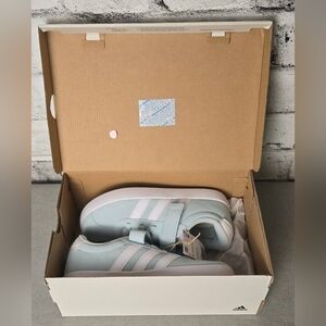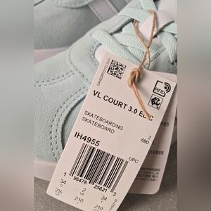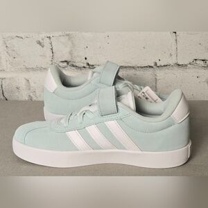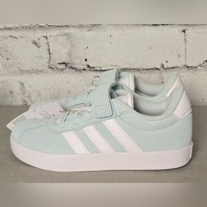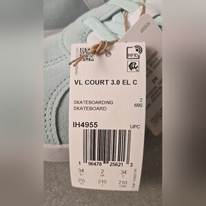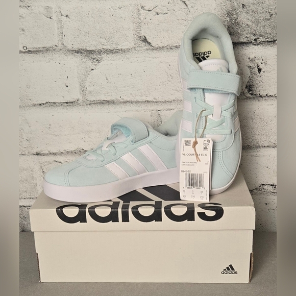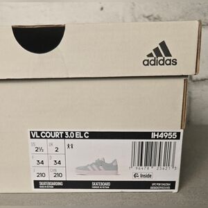Brand new with tags and box — Adidas VL Court 3.0 EL C kids skateboarding shoes in a stylish light blue and white colorway. Features the signature 3-stripe design, hook-and-loop strap for easy on/off, and soft synthetic suede upper for durability. Cushioned insole and flexible rubber outsole provide comfort and grip for active kids. Made in Vietnam, model IH4955, US size 2.5 (Little Girl). Perfect blend of sporty and casual streetwear style!
