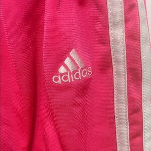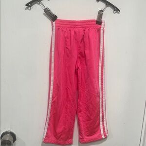 Bright pink Adidas track pants with classic white stripes. Perfect for active kids. Size 3T