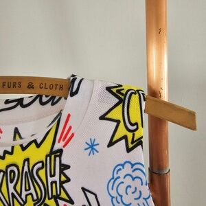 • Adidas logo and wacky Batman Esq. phrases on front (Front of shirt)