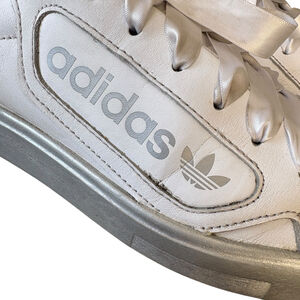 Adidas, White Leather, Satin Laces, Metallic Accent, Sleek Sneaker, Streetwear, Minimalist, Contemporary, Athleisure, Fashion Sneaker, Neutral, Y2K, Retro Inspired, adidas white leather sneakers, adidas satin lace sneaker, adidas silver outsole sneakers, sleek white adidas shoes size 7.5, adidas metallic accent sneaker, futuristic white sneaker, downtown streetwear trainers, silver accent kicks, luxe minimalist sneaker, fashion-forward white leather trainer