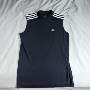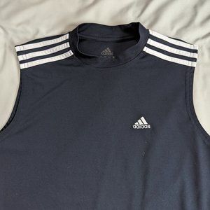 Adidas tank top with white stripes on the shoulders. Body colour is a very dark navy blue (almost black).
