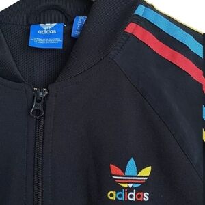 Women's Adidas Superstar track jacket. Black with multicolored stripes. Zip-up front. Features an Adidas logo on the chest and a larger one on the back. Pockets with zips on the sides.