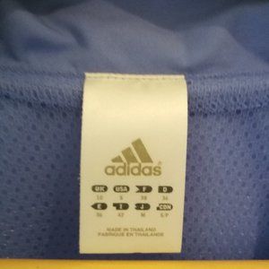 Adidas Climalite women's light jacket size small, light blue with black trim with collar. two pockets at waist, and one pocket near the armpit (see photo) excellent condition. full zip up. 22 inches from neck to waist at the back.