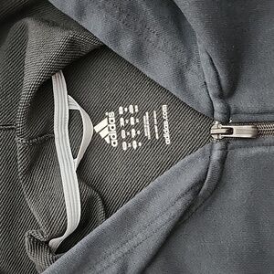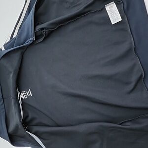 Excellent pre-owned condition, Adidas navy blue zippered hoodie with signature 3 white stripes down each sleeve and front pockets, size medium.