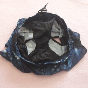 - Funky pattern in shades of blue and white. Black trim and side panels.