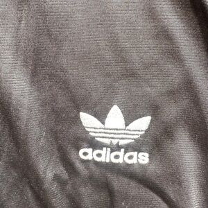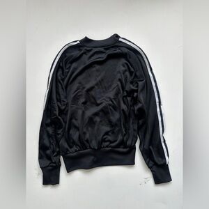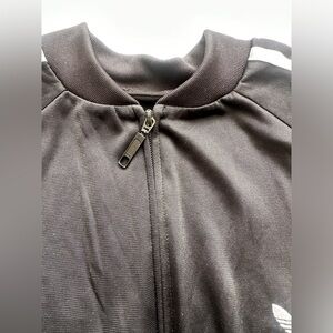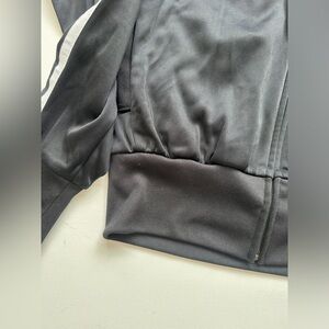 A great active wear piece, zip up front, pockets, wide waist band. Stripes down sleeves. Light weight.