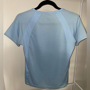 Light blue adidas activewear tee. V neck with mesh panelling. Some cracking on logo as pictured.