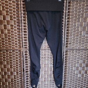 Stylish black leggings with foot straps. Perfect for active wear. Comfortable and versatile. Fun rushing details on the legs and a foldover waist.