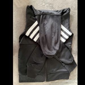 Adidas jacket with hood, long sleeves, zipper and black color with white rails on the sleeves