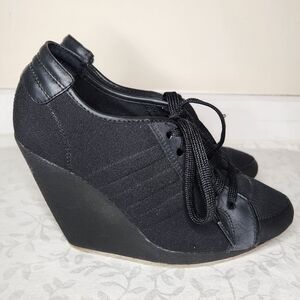 Black on Black leather & canvas wedge high heel laceup sneakers with classic stripes, SLVR by ADIDAS.