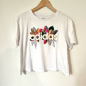Adidas x Farm Rio Floral Logo Cropped White T Shirt Size Large. Has a little stain on right shoulder, otherwise great condition.