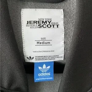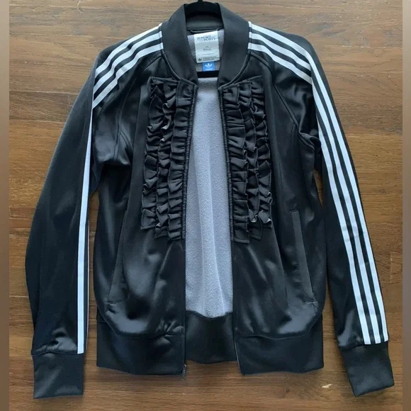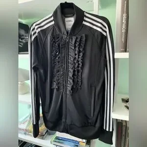 Part of Jeremy Scott’s first collaboration collection with Adidas 2008. Very Rare black and white colorway with a classic track jacket feel and fit. Tuxedo ruffle front to give that flair that Jeremy Scott is known for. Gently used but in great condition.