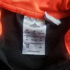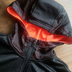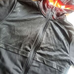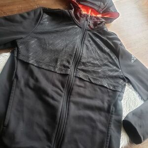 Features: Hood, full zip, pockets in front, mesh feature on front and back with black on black pattern, Adidas logo on sleeve