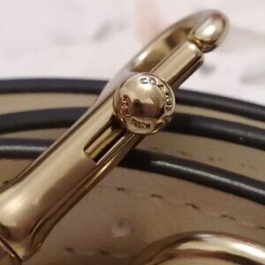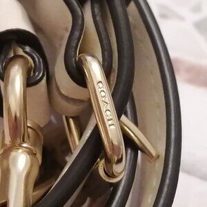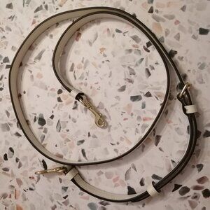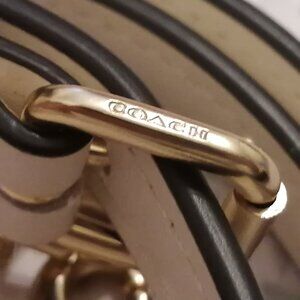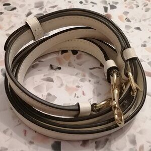 This listing is for a purse strap made by Coach. It is NWOT, perfect condition. The strap is made in cream coloured leather with gold tone hardware. It adjusts like a belt and attaches to a bag with small snap clips. It is branded Coach on the buckle and Coach New York on the tiny buttons you use to pull back the clips. This strap measures 0.5" wide. As it comes, it is about 49" long but adjusting it to it's max length would add approximately 3.5" to that length.