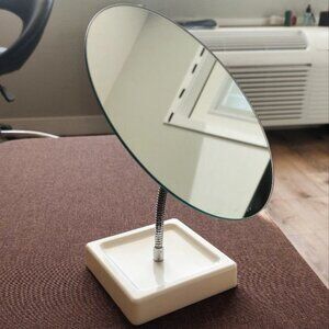 Compact tabletop mirror with a flexible neck and detachable parts. Easily adjusts to different angles for comfortable daily use, making it easy to store, transport, or pack for travel.