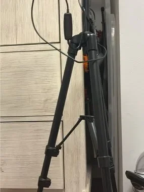 Lightweight adjustable ring light Sturdy 4 leg support. Telescoping legs with locks. Ideal for cameras, lights, or recording gear.