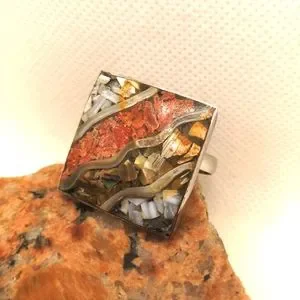 Silver tone adjustable resin ring inlaid with shell and coral.