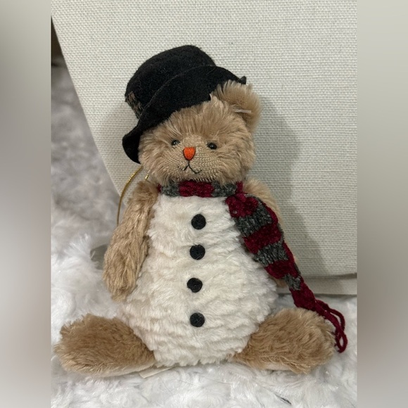 Cute teddy bear dressed as a snowman with a black hat and red scarf. Perfect for holiday decor.