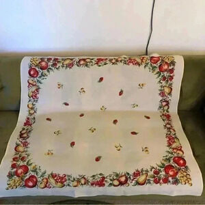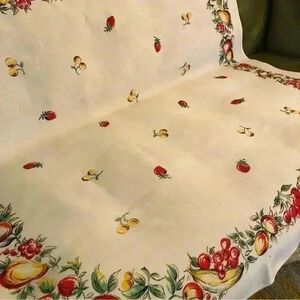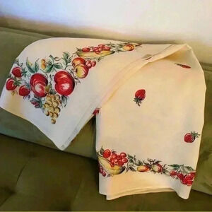 Adorable Vintage linen tablecloth with colourful fruit design. Bordered by clusters of apples, grapes, plums, bananas, cherries and strawberries with scattered individual fruits throughout. The fabric is an unbleached linen, so is an off-white shade. Measures 43.5โ square. Two of the edges are raw but unfrayed. It appears to be free of any stains or discolouration. There are no rips or ragged edges. There are no tags, so I cannot be certain if this is actually vintage or a modern reproduction, but it looks great either way. Please note that it will definitely need to be ironed after transport due to the nature of linen ๐