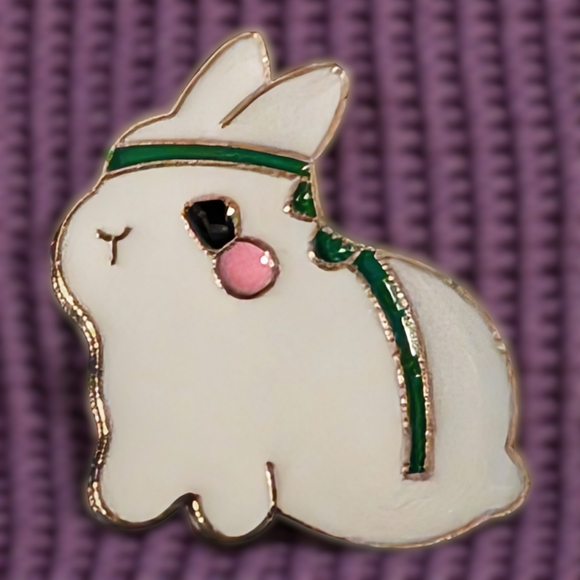 This charming white bunny pin features delightful green accents, perfect for adding a touch of whimsy to your accessories. Ideal for small pet lovers.