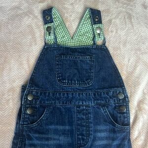 Adorable Wrangler Dark Blue Denim Overalls Baby 24 months Green Checked interior