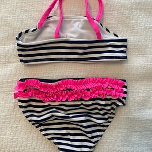 Stylish striped bikini with vibrant pink accents. Perfect for a day at the beach. I would say this one runs a bit big if your child is on a smaller side.
