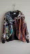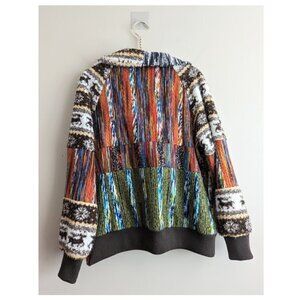 Fuzzy textured material, partial discreet reindeer print, partial tapestry of rainbow colours, partial rose floral print, very artsy piece! Ribbed cuffs and bottom hem. Two snap button closure at collar line. Very one of a kind piece!