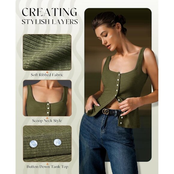 Adorpop Womens Army Green Ribbed Sleeveless Blouses Button Down Henley Shirts