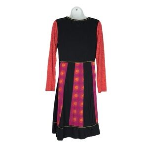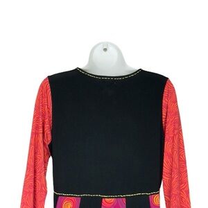 Adria Mode Bohemian Black Multicolour Long Sleeve Aline Short Dress is in very good preloved condition. Please note that I have used AI to generate my first photo. It’s not exact but gives you an idea of what it looks like on. The dress is primarily black with long sleeves that have an orange and red swirling pattern. The skirt portion of the dress incorporates panels of fabric with a pink and orange circular design, separated by black panels. Comfy fit with an eye-catching pattern and fit and flare style. I’m 5’8” and this dress falls just below my knees.