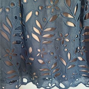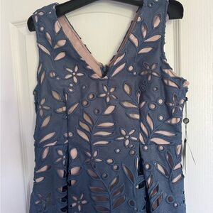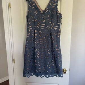 This stunning fit and flare dress by Adrianna Papell features a sleeveless design with a flattering V-neckline, perfect for wedding guest or cocktail occasions. The blue lace overlay adds a touch of elegance, while the defined waistline and midi length create a graceful silhouette.