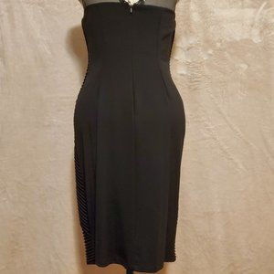 Adrianna Papell knee-length black bodycon bandage dress, with black mesh and gems on chest and over shoulders. Dress has a zipper up the back and an inner lining. The dress is in very good condition, and only has 1 tiny torn mesh hole (as pictured) that is barely visible. This dress is sexy and sophisticated.