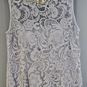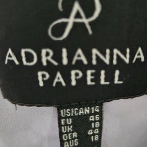 Gorgeous Adrianna Papell dress in a shade of violet grey. Size US 14 but more appropriate fit would be 10-12. The bottom of this dress sits just below the knee on a 5' 5" frame. Outer lace is double lined with polyester. This dress was worn once by the Mother-of-the-Bride. Beautiful condition. This item ships from Ottawa Ontario. Shipping not included in price.