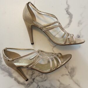 Adrianna Papell Elixir High Heel Strappy Stiletto Heel Sandal in Gold Platinum with Rhinestone Detailing
