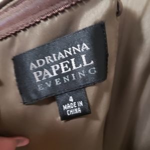 Lace overlay, copper dress in size 4 by Adrianna Papell. New with tag. Due to the nature of the material used, some loose threads but doesn't affect the dress at all. Zipper and hook and eye back closure