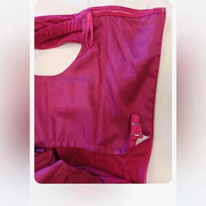 Bright Syrah in color this stretchy maxi features drop shoulders and zipper/clasp closure in the back. Fully lined, includes a reinforced bodice with adjustable closure. 19" shoulder to shoulder