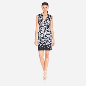 Sleeveless sheath dress in allover floral featuring V-neckline with Mandarin collar