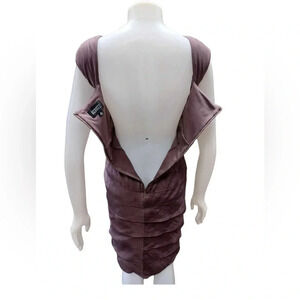 Taupe colored this shutter pleat, ruffle dress features a back zipper and clasp closure and is fully lined. Sleeveless with a V neck, this midi has very little stretch available.