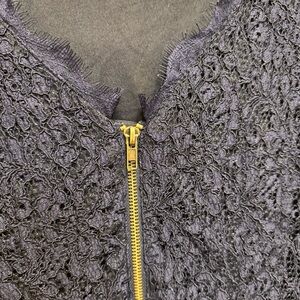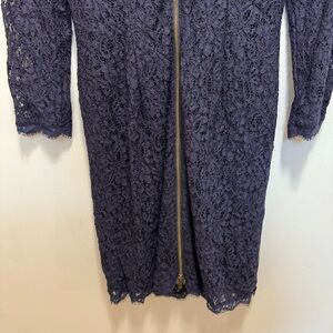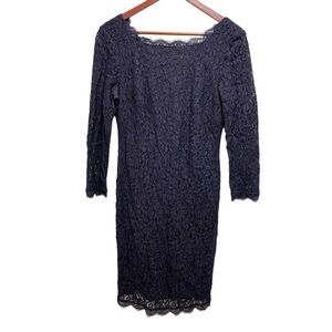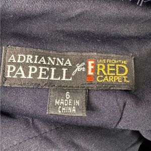 Gorgeous dress by Adrianna Papell for E Live from the Red Carpet. Navy blue dress with a lace overlay. 3/4 length sleeves. Square type neckline V-backline with a full exposed zipper in back. Dress is lined except for sleeves.