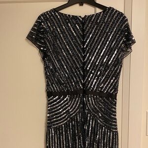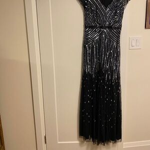 Stunning Adrianna Papell sequinned evening gown with art deco design. Fits beautifully. Fully lined. Flared skirt bottom. Excellent condition. Size 4 but fits like a size 6