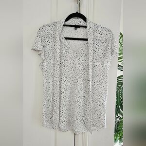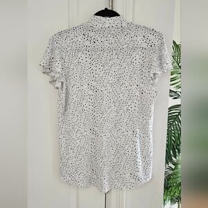 This elegant top by Adrianna Papell features a classic black and white polka dot color scheme with a charming tie front detail. short sleeves , perfect for both casual and business casual settings. Its lightweight fabric ensures comfort and style throughout the day.