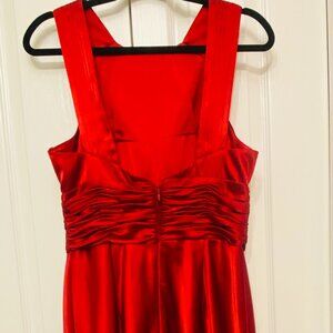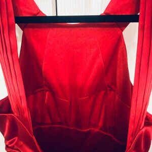 Do you need a little red dress? This is beautifully made with the front pleats and pleated straps that expose more of your shoulders. You can't see it very well, but there are bra pads sewn into the inside of the front bodice. No bra required! The dress is fully lined. It's a gorgeous cool red with a shine like satin. Doesn't wrinkle easily though. Knee length. Looks fancy but very comfortable.